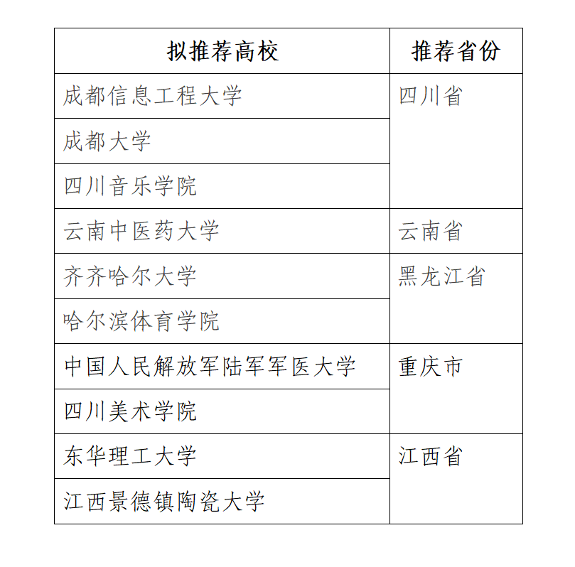 截至7月25日,全国已有四川、云南、黑龙江、重庆、江西5个省市教育厅(教委)陆续公示了拟推荐新增推免资格高校名单,共计10所院校入选。